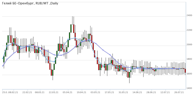 Цены на гелий газообразный, базис поставки Оренбургская область, снизились за неделю на 54 рубля до 1631 рубля за кубический метр.