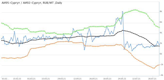 Разница цен между 95-м и 92-м бензином на базисе Сургут (Ханты-Мансийский а.о.).