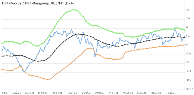 Разница цен между ПБТ на базисе Ростов и ПБТ на базисе Владимир.