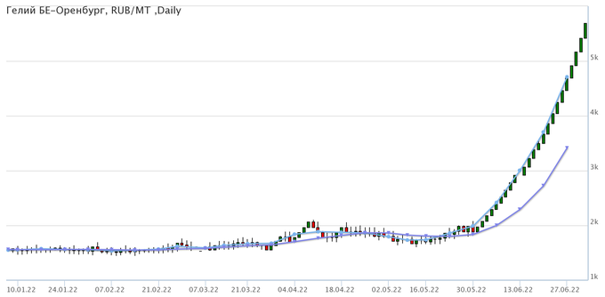 Цены на гелий газообразный, базис поставки Оренбургская область, выросли за неделю на 1232 рубля до 5697 рублей за кубический метр.