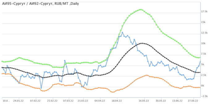Разница цен между 95-м и 92-м бензином на базисе Сургут (Ханты-Мансийский а.о.).