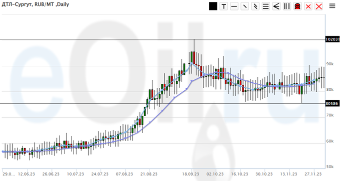 Цены на топливо дизельное ДТ-А-К5, базис поставки Ханты-Мансийский АО, выросли за неделю на 2041 рубль до 85541 рубля за тонну.