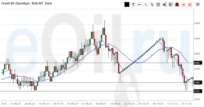 Цены на гелий газообразный, базис поставки Оренбургская область, не изменились за неделю, и составляют 4229 рублей за кубический метр.