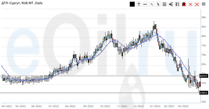 Цены на топливо дизельное ДТ-А-К5, базис поставки Ханты-Мансийский АО, снизились за неделю на 695 рублей до 53877 рублей за тонну.