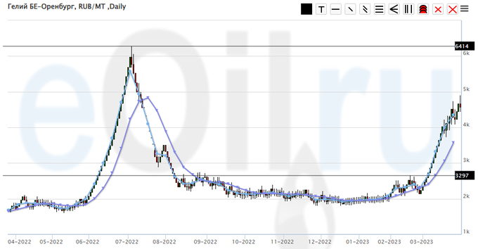 Цены на гелий газообразный, базис поставки Оренбургская область, выросли за неделю на 57 рублей до 4572 рублей за кубический метр.