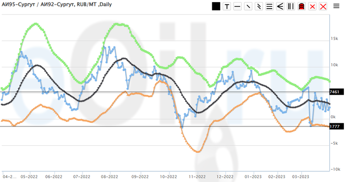 Разница цен между 95-м и 92-м бензином на базисе Сургут (Ханты-Мансийский а.о.).