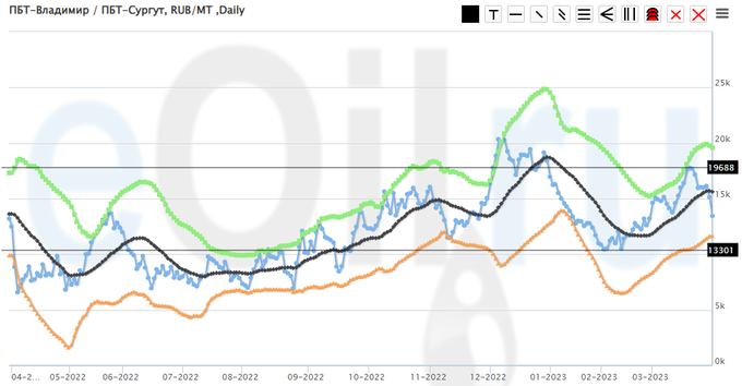 Разница цен между ПБТ на базисе Владимир и ПБТ на базисе Сургут (Ханты-Мансийский а.о.).