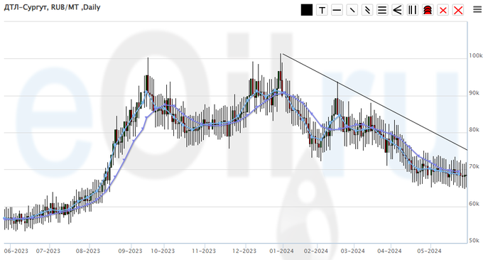 Цены на топливо дизельное ДТ-А-К5, базис поставки Ханты-Мансийский АО, снизились за неделю на 44 рубля до 68456 рублей за тонну.