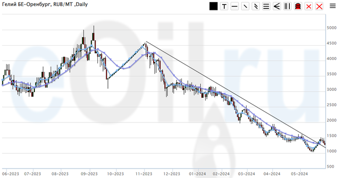 Цены на гелий газообразный, базис поставки Оренбургская область, снизились за неделю на 103 рубля до 1268 рублей за кубический метр.