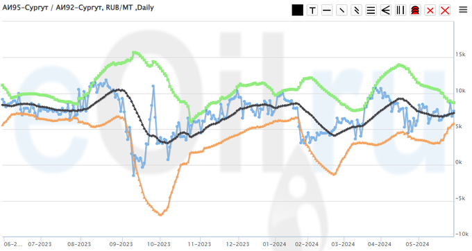 Разница цен между 95-м и 92-м бензином на базисе Сургут (Ханты-Мансийский а.о.).