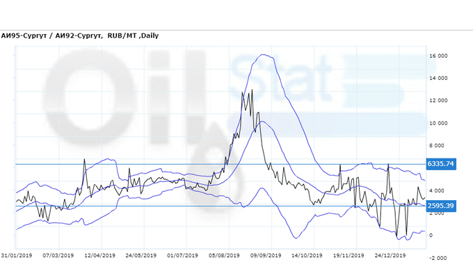 Разница цен между 95-м и 92-м бензином на базисе Сургут (Ханты-Мансийский а.о.).