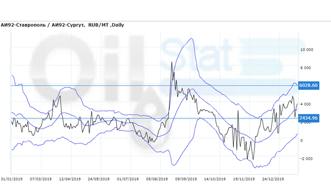 Разница цен между 92-м бензином на базисе Ставрополь и 92-м бензином на базисе Сургут (Ханты-Мансийский а.о.).