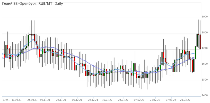 Цены на гелий газообразный, базис поставки Оренбургская область, выросли за неделю на 144 рубля до 1704 рублей за кубический метр.