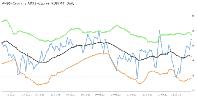 Разница цен между 95-м и 92-м бензином на базисе Сургут (Ханты-Мансийский а.о.).