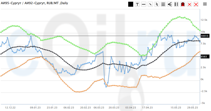 Разница цен между 95-м и 92-м бензином на базисе Сургут (Ханты-Мансийский а.о.).