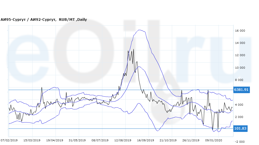 Разница цен между 95-м и 92-м бензином на базисе Сургут (Ханты-Мансийский а.о.).