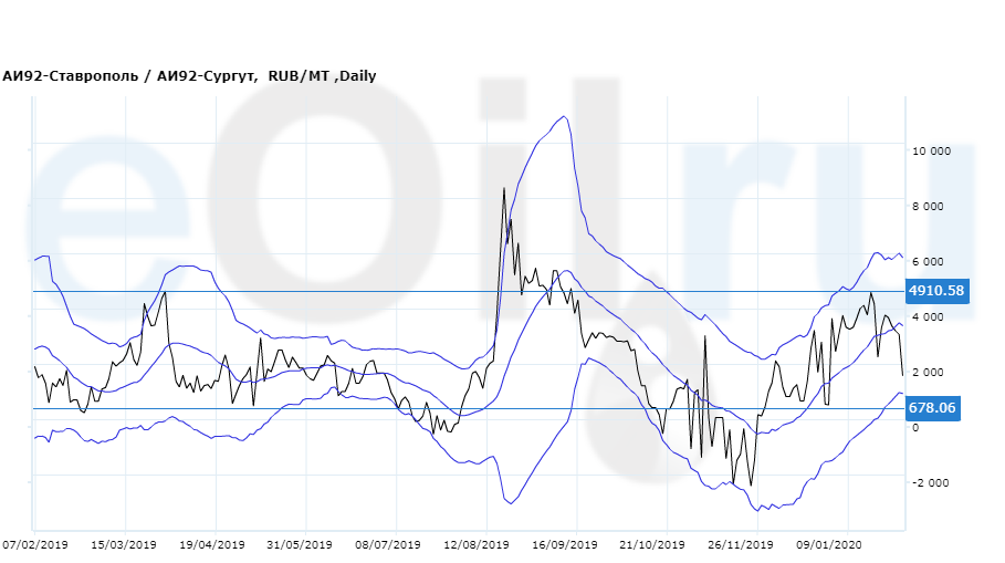 Разница цен между 92-м бензином на базисе Ставрополь и 92-м бензином на базисе Сургут (Ханты-Мансийский а.о.).