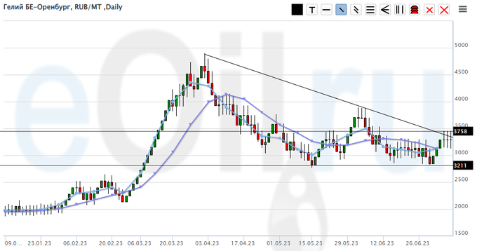 Цены на гелий газообразный, базис поставки Оренбургская область, выросли за неделю на 306.52 рублей до 3295 рублей за кубический метр.