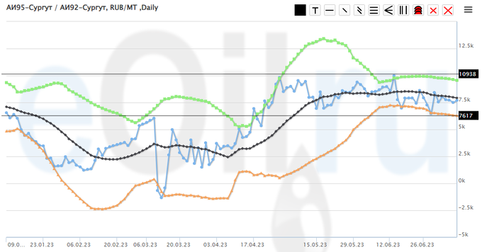 Разница цен между 95-м и 92-м бензином на базисе Сургут (Ханты-Мансийский а.о.).