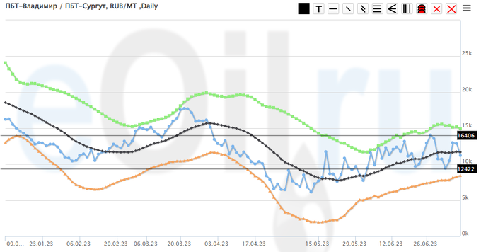 Разница цен между ПБТ на базисе Владимир и ПБТ на базисе Сургут (Ханты-Мансийский а.о.).