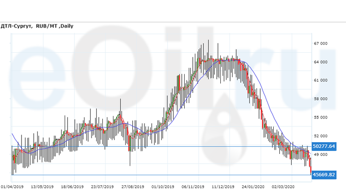 Цены на топливо дизельное ДТ-А-К5, базис поставки Ханты-Мансийский а.о., упали за неделю на 2500 рублей до 46031 рубля за тонну.