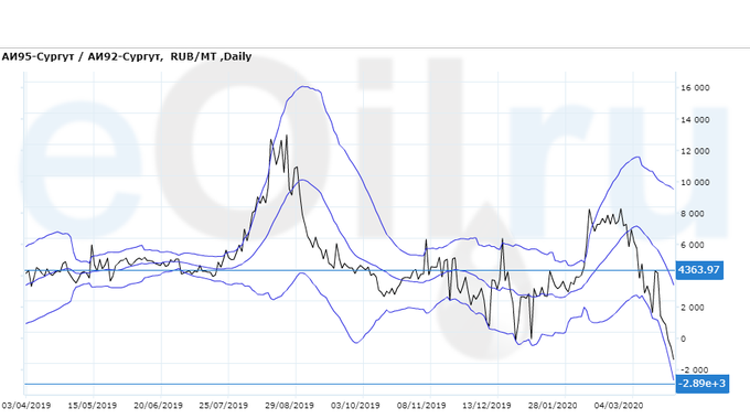 Разница цен между 95-м и 92-м бензином на базисе Сургут (Ханты-Мансийский а.о.).