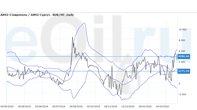 Разница цен между 92-м бензином на базисе Ставрополь и 92-м бензином на базисе Сургут (Ханты-Мансийский а.о.).