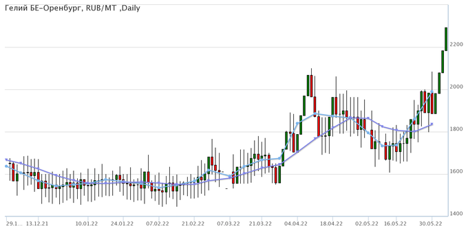 Цены на гелий газообразный, базис поставки Оренбургская область, выросли за неделю на 308 рублей до 2293 рублей за кубический метр.