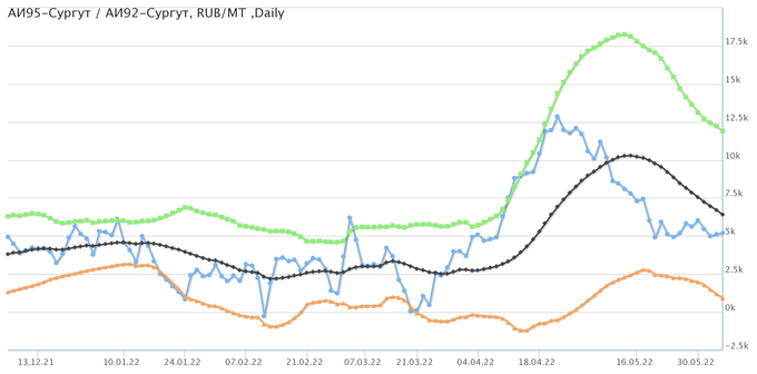 Разница цен между 95-м и 92-м бензином на базисе Сургут (Ханты-Мансийский а.о.).