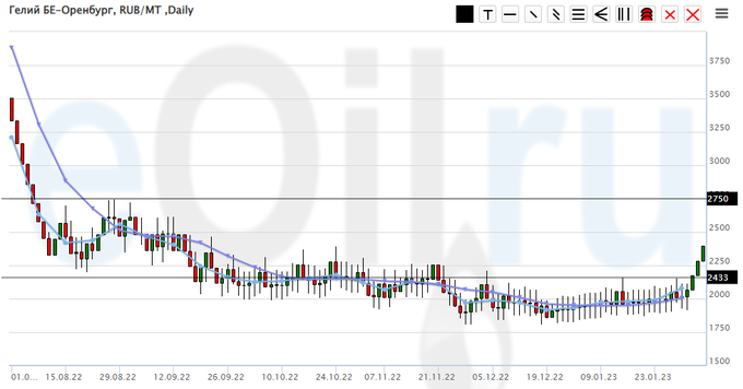 Цены на гелий газообразный, базис поставки Оренбургская область, выросли за неделю на 385 рублей до 2396 рублей за кубический метр.