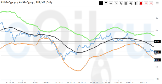 Разница цен между 95-м и 92-м бензином на базисе Сургут (Ханты-Мансийский а.о.).