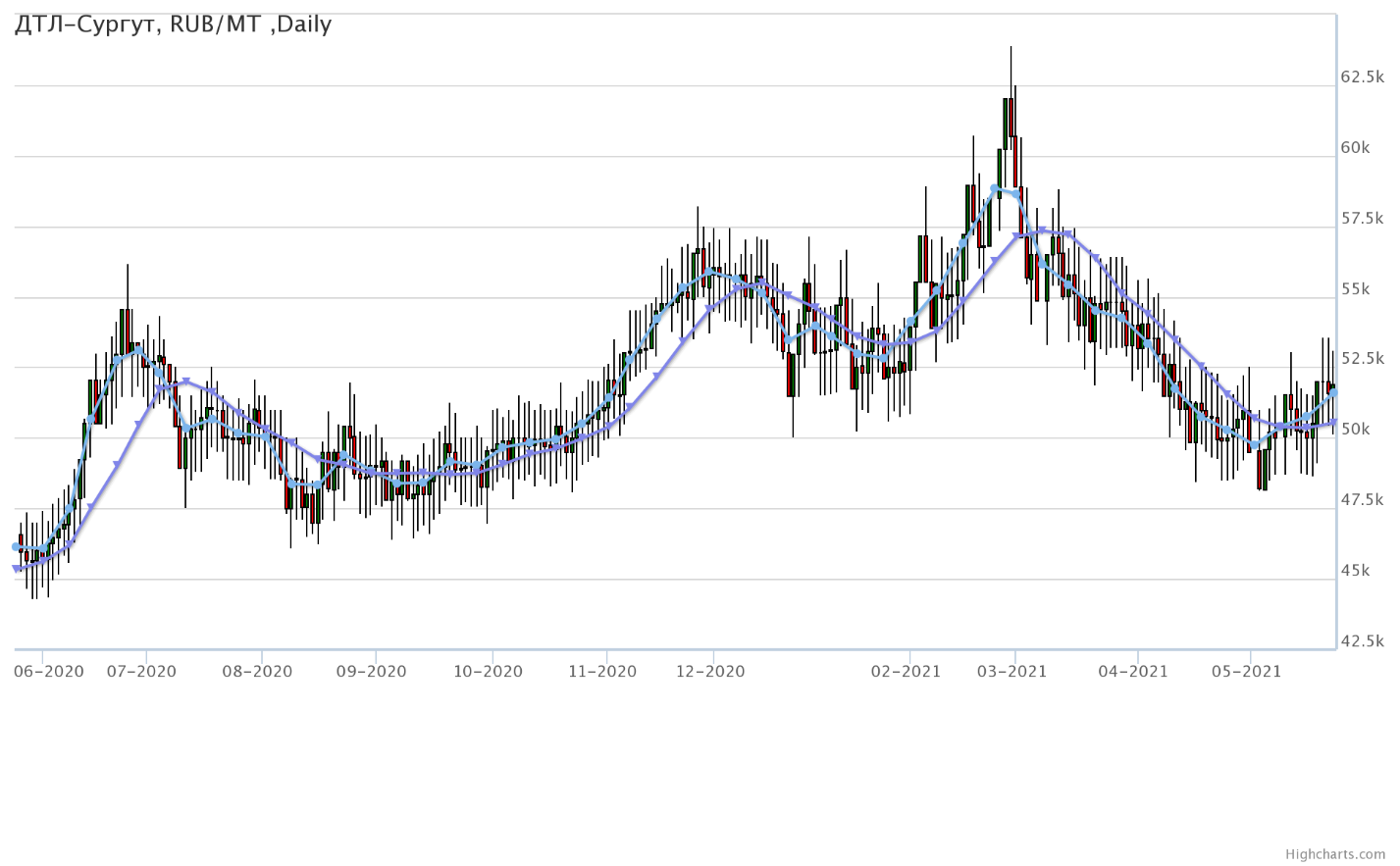 Цены на топливо дизельное ДТ-А-К5, базис поставки Ханты-Мансийский АО, выросли за неделю на 1265 рублей до 53850 рублей за тонну.