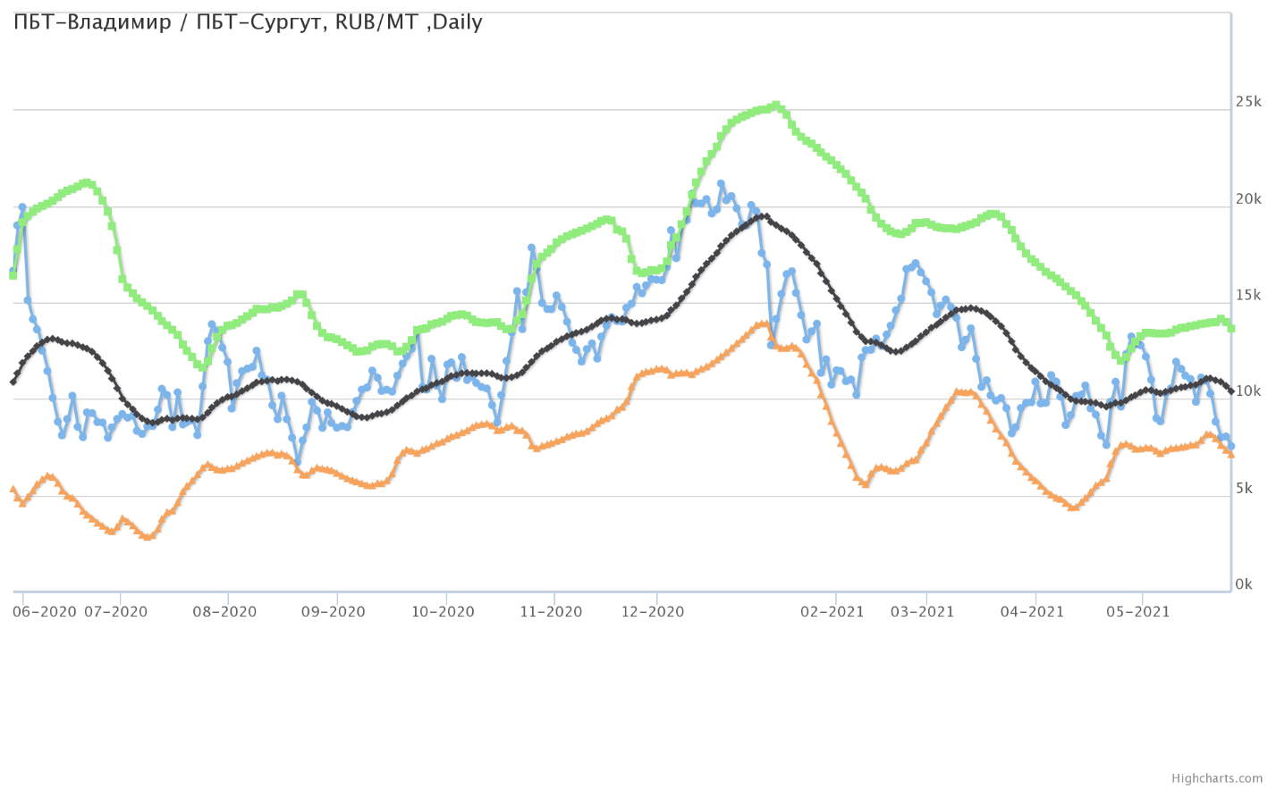 Разница цен между ПБТ на базисе Владимир и ПБТ на базисе Сургут (Ханты-Мансийский а.о.).
