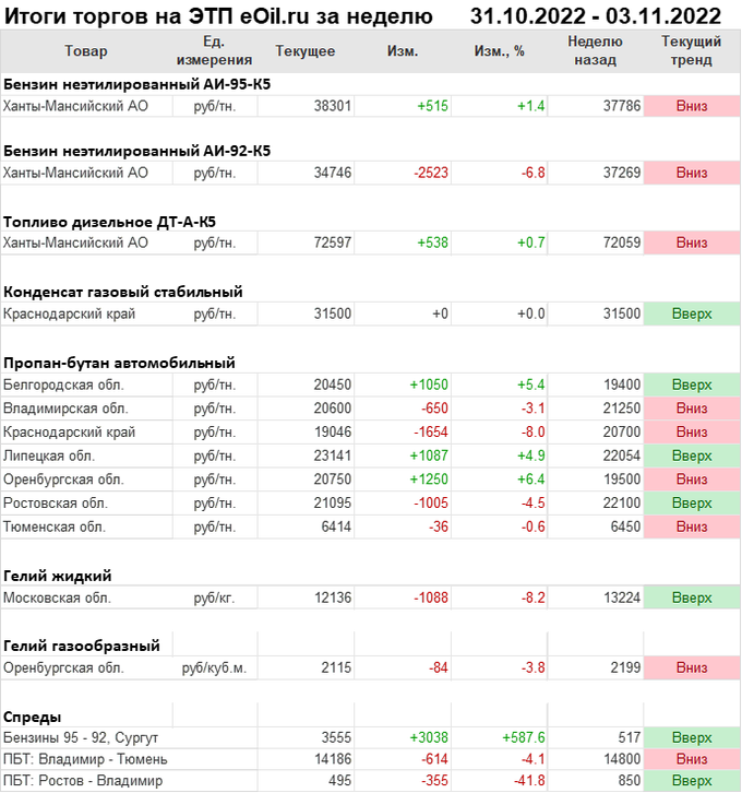 Итоги торгов на ЭТП eOil.ru с 31 октября по 3 ноября 2022 года