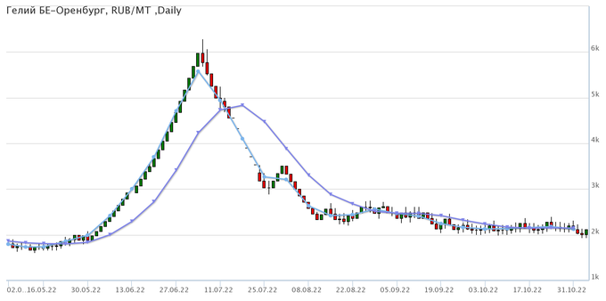 Цены на гелий газообразный, базис поставки Оренбургская область, снизились за неделю на 84 рубля до 2115 рублей за кубический метр.