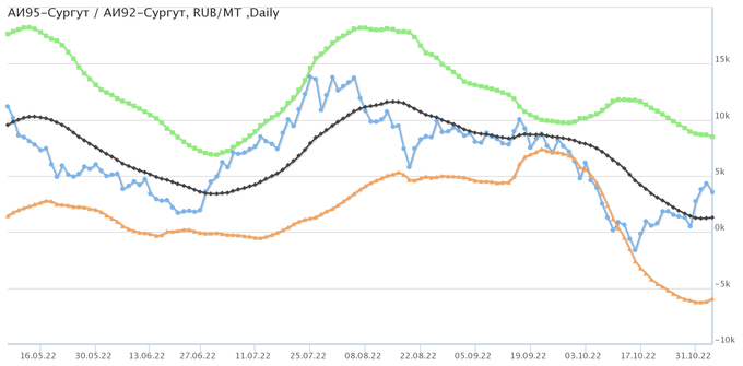 Разница цен между 95-м и 92-м бензином на базисе Сургут (Ханты-Мансийский а.о.).