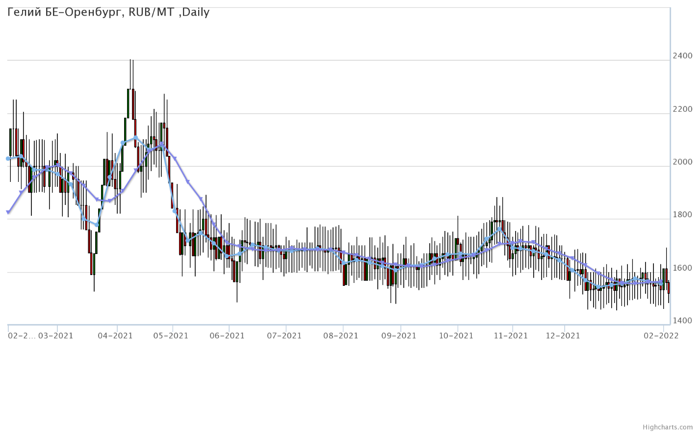 Цены на гелий газообразный, базис поставки Оренбургская область, снизились за неделю на 21 рубль до 1530 рублей за кубический метр.