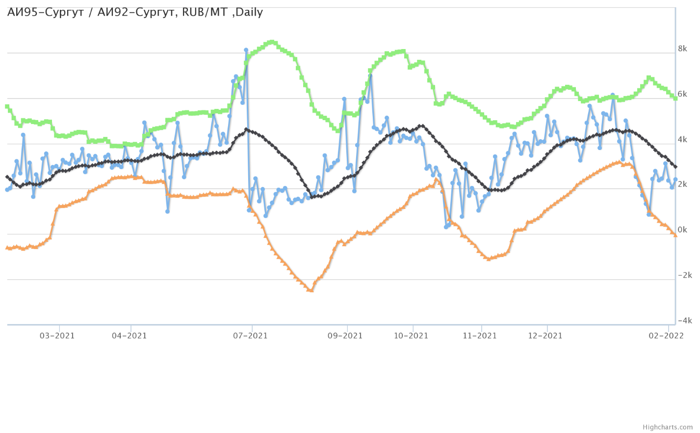 Разница цен между 95-м и 92-м бензином на базисе Сургут (Ханты-Мансийский а.о.).