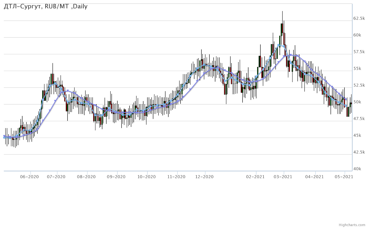 Цены на топливо дизельное ДТ-А-К5, базис поставки Ханты-Мансийский АО, выросли за неделю на 502 рубля до 50033 рублей за тонну.