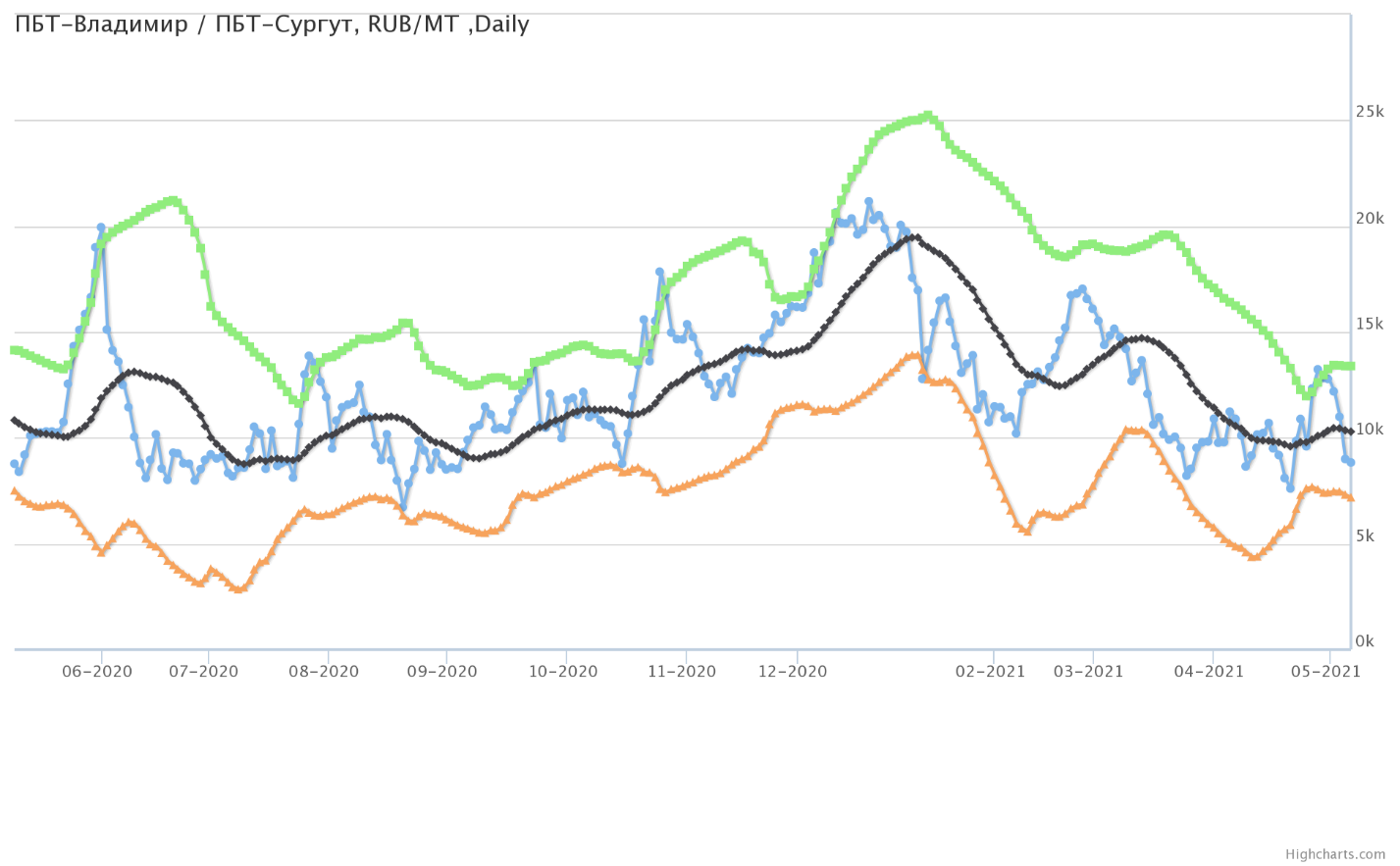 Разница цен между ПБТ на базисе Владимир и ПБТ на базисе Сургут (Ханты-Мансийский а.о.).