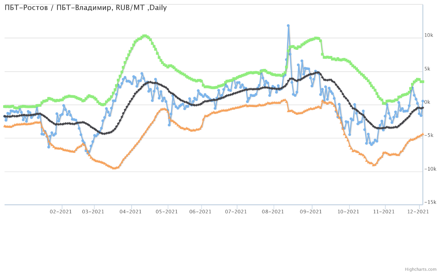 Разница цен между ПБТ на базисе Ростов и ПБТ на базисе Владимир.