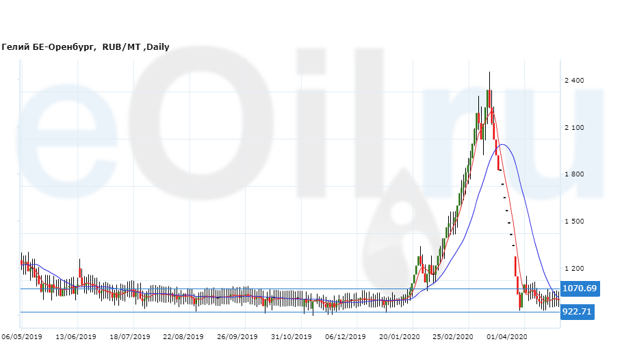 Цены на гелий газообразный, базис поставки Оренбургская область, упали за неделю на 6 рублей до 997 рублей за кубический метр.