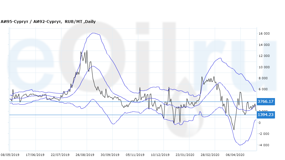 Разница цен между 95-м и 92-м бензином на базисе Сургут (Ханты-Мансийский а.о.).