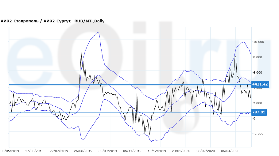 Разница цен между 92-м бензином на базисе Ставрополь и 92-м бензином на базисе Сургут (Ханты-Мансийский а.о.).