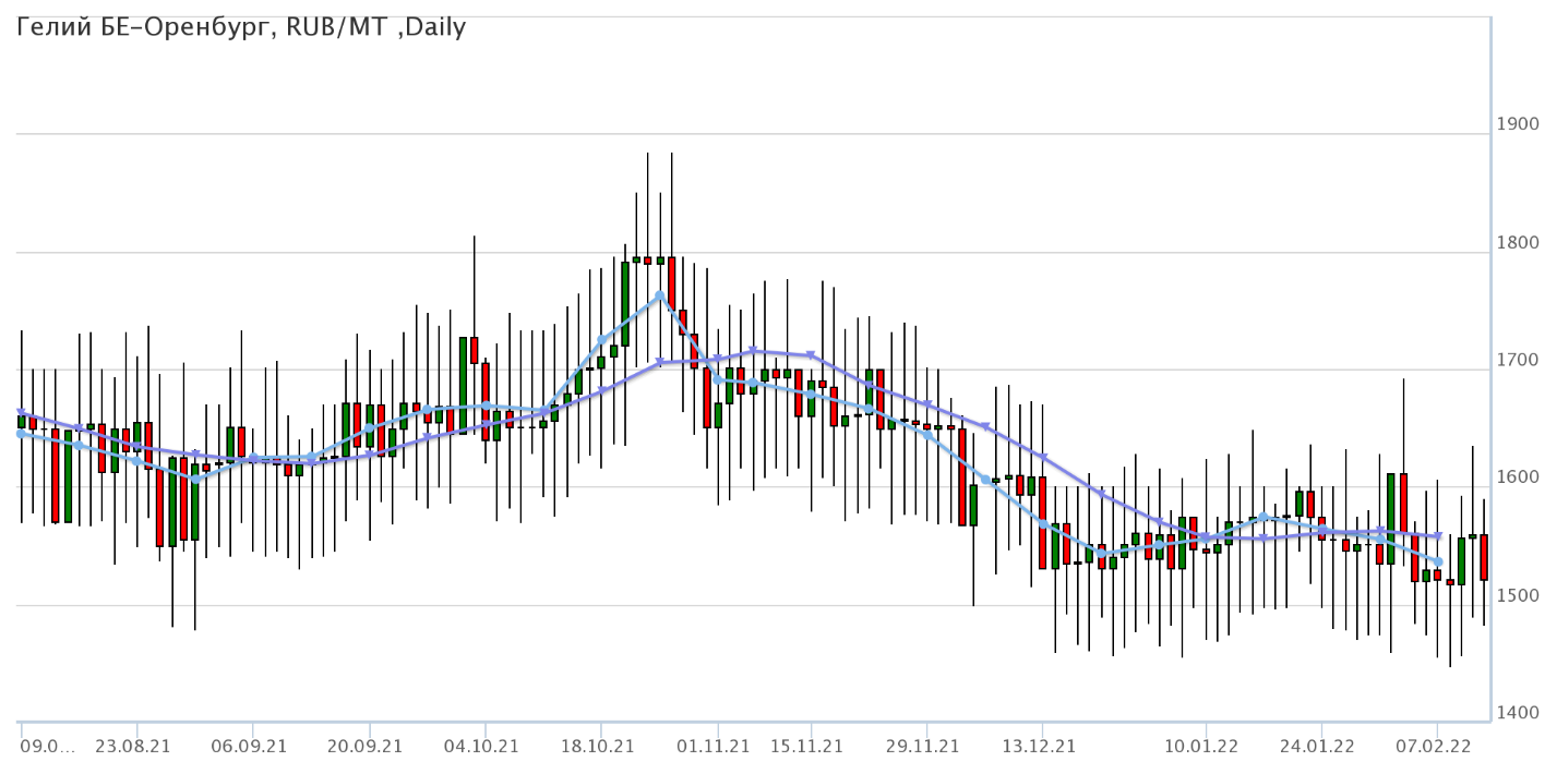 Цены на гелий газообразный, базис поставки Оренбургская область, снизились за неделю на 9 рублей до 1521 рубля за кубический метр.