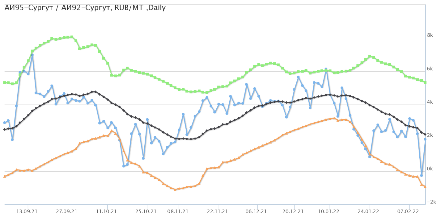 Разница цен между 95-м и 92-м бензином на базисе Сургут (Ханты-Мансийский а.о.).