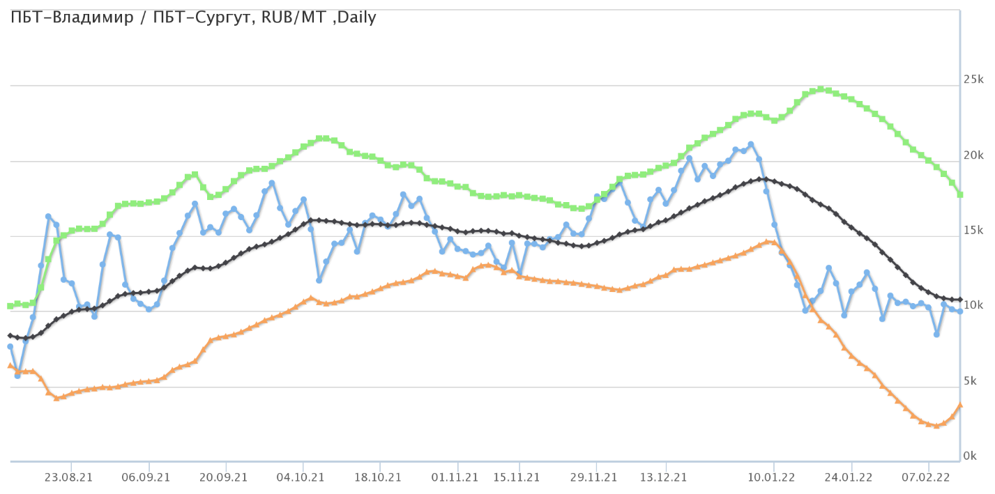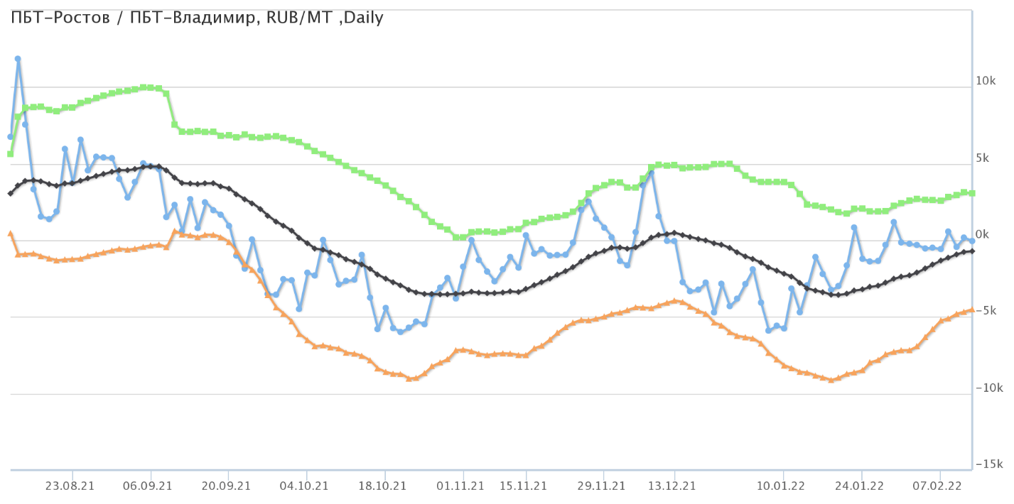 Разница цен между ПБТ на базисе Ростов и ПБТ на базисе Владимир.