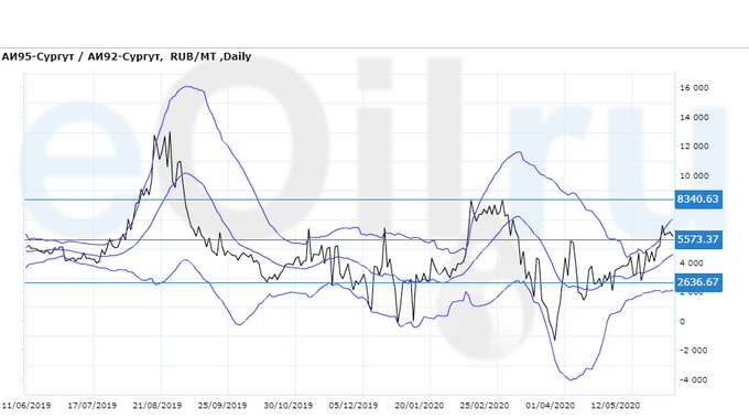 Разница цен между 95-м и 92-м бензином на базисе Сургут (Ханты-Мансийский а.о.).