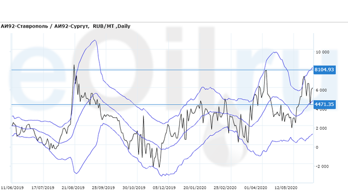 Разница цен между 92-м бензином на базисе Ставрополь и 92-м бензином на базисе Сургут (Ханты-Мансийский а.о.).