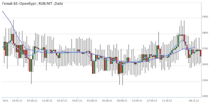Цены на гелий газообразный, базис поставки Оренбургская область, снизились за неделю на 19 рублей до 1661 рубля за кубический метр.